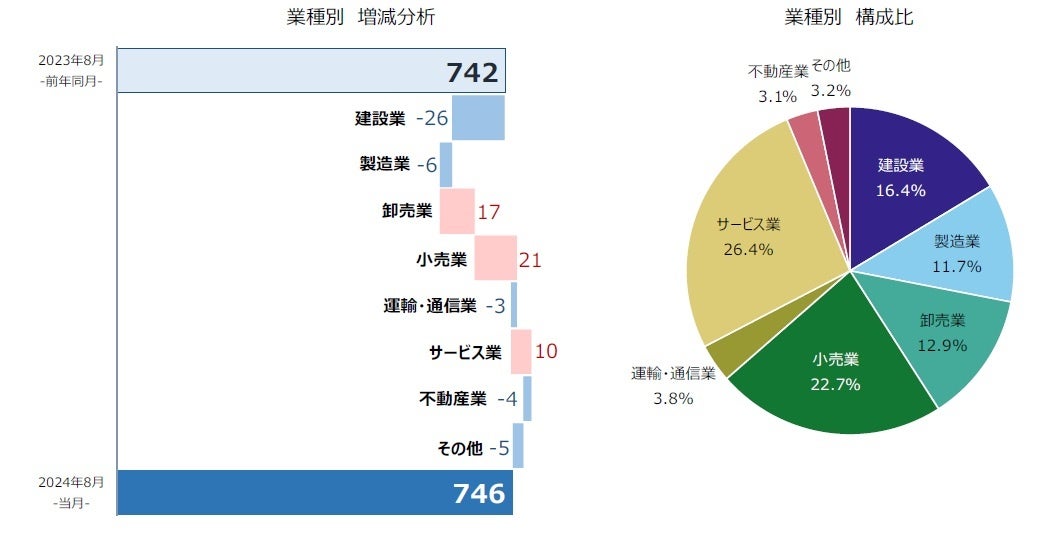 業種別にみると、7業種中3業種で前年同月を上回った。『サービス業』(前年同月187件→197件、5.3%増)が最多、『小売業』(同148件→169件、14.2%増)、『建設業』(同148件→122件、17.6%減)が続いた。『小売業』は、2022年9月(108件)以降、24カ月連続で前年同月を上回った。『運輸・通信業』(同31件→28件、9.7%減)は、2カ月連続で前年同月を下回った。増加率でみると、『卸売業』(同79件→96件、21.5%増)が最も高かった。