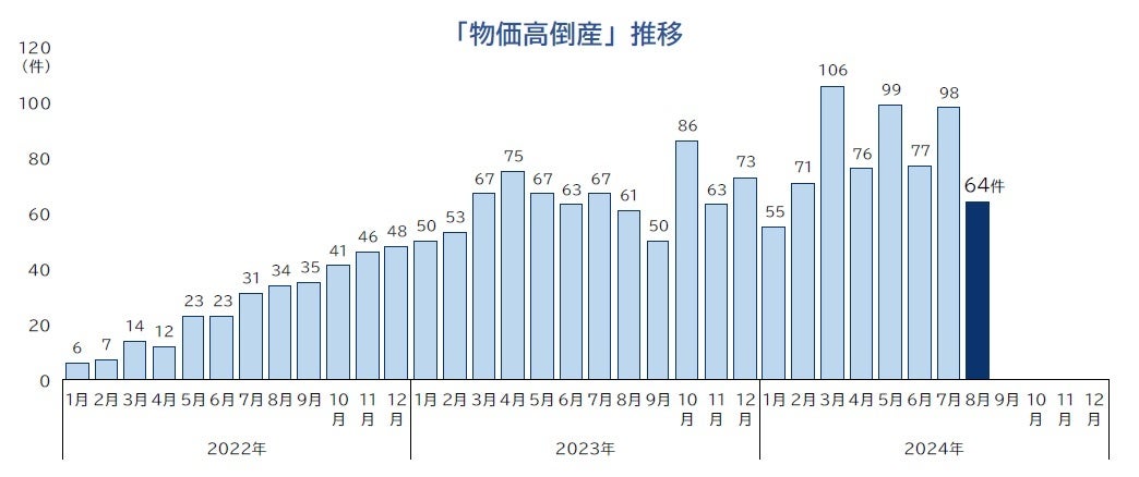 ■物価高(インフレ)倒産 2024年8月は64件発生 「値上げ難型」は12件