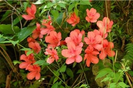 ② ひとたび大雨が降ると、川は濁流となって水辺の生き物を襲います。そのような渓流沿いの環境では、激しい流れに適応したサツキやヤシャゼンマイなどの日本固有種が生まれました。水面近くに生えているヤシャゼンマイは、細長い葉を持ち、水に流されにくい性質を持っています。