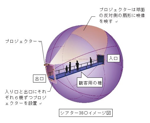 直径12.8m(地球の100 万分の1)のドームの内側すべてがスクリーンになっており、中のブリッジで鑑賞します。360°全方位に映像が映し出され、独特の浮遊感などが味わえるシアターです。