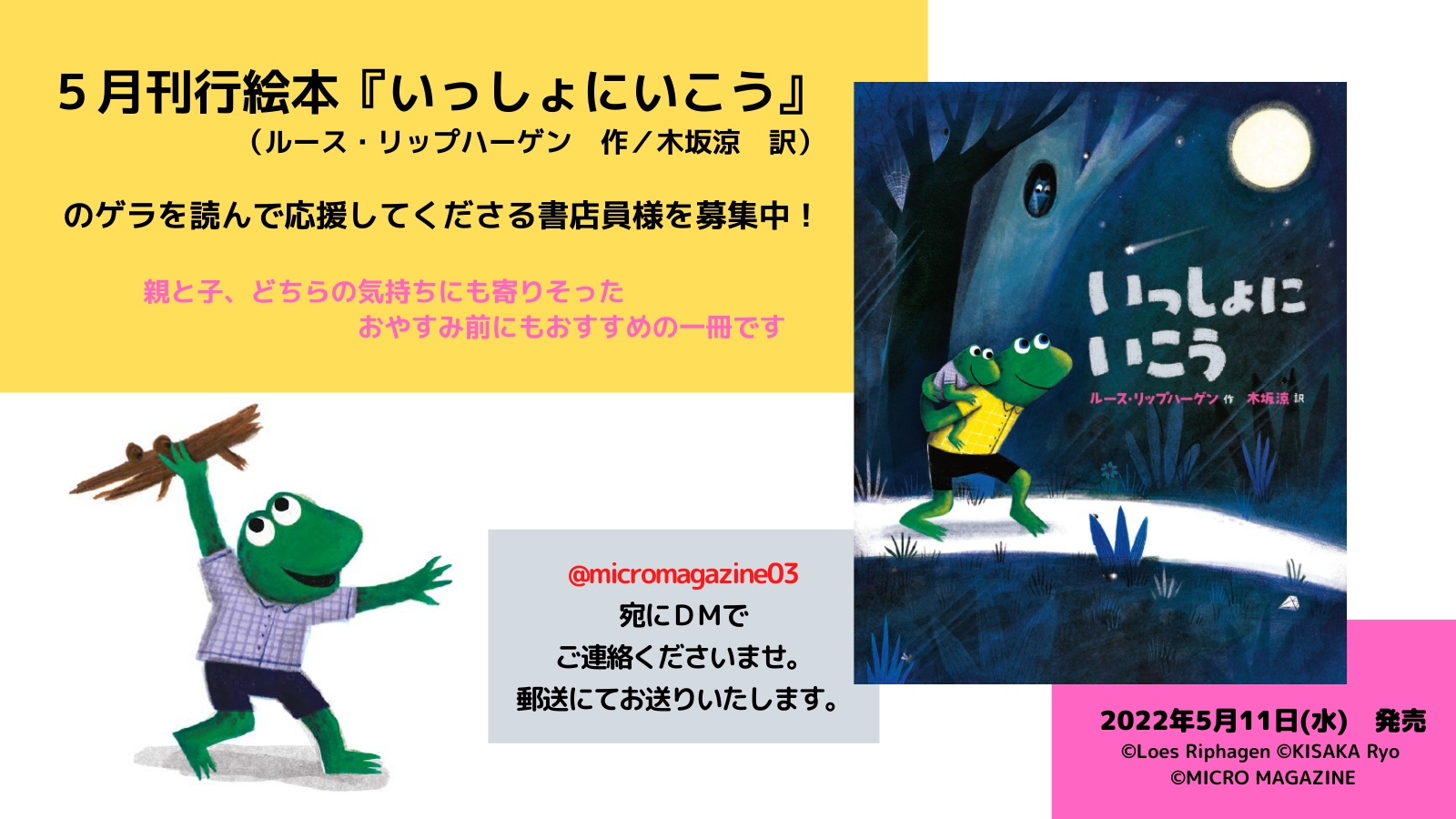 マイクロマガジン社(東京都中央区)は、2022年5月11日刊行予定の絵本『いっしょにいこう』のゲラ(校了前の原稿)を読んでくださる書店員さまを募集しております。