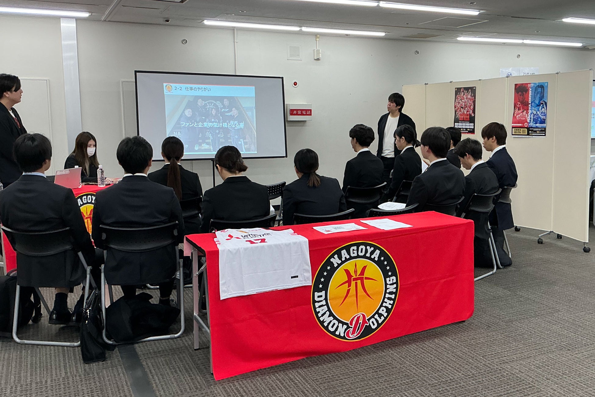 その一方で、バスケットボールBリーグの名古屋ダイヤモンドドルフィンズにはアスカチをきっかけに採用され、働いている社員がいます。「新アリーナになった今シーズンは、始まるまでは誰もが初めての経験で、育てることができているかは分かりませんが、一緒にがんばってくれています」とし、「ドルフィンズには、人と関わることが好きだったり、ドルフィンズスマイルという社会貢献活動に興味を持ってくれる学生に親和性が高いと思います。試合という特別な1日をつくりあげるのには、たくさんの人の協力があってできることで、試合をつくりあげる達成感がありますね。同じクラブでも部署や担当によって仕事はそれぞれ。私はパートナーデー(スポンサー)の販売を担当していますが、『企業が何を求めているんだろう』と、ファンと企業の架け橋になることにやりがいを感じています」と話しました。