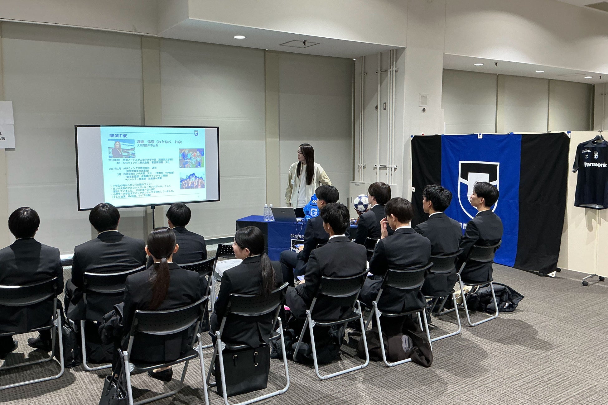 エスエスケイが開催しているということで、プロスポーツクラブの参加が多いのがアスカチの特徴のひとつ。サッカーJリーグからガンバ大阪、バレーボールSVリーグから大阪ブルテオンの話を聞くことができましたが、いずれも新卒採用の予定はなし。両クラブは専門性を高めた上で中途採用のドアを叩いてほしいという意味合いで参加しています。