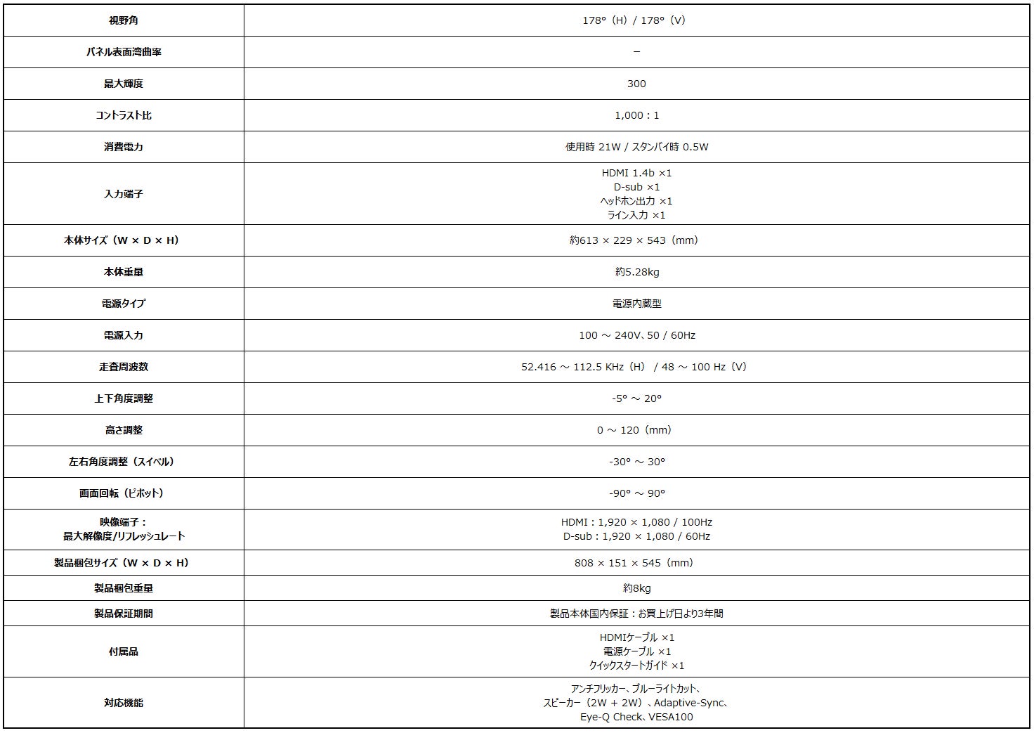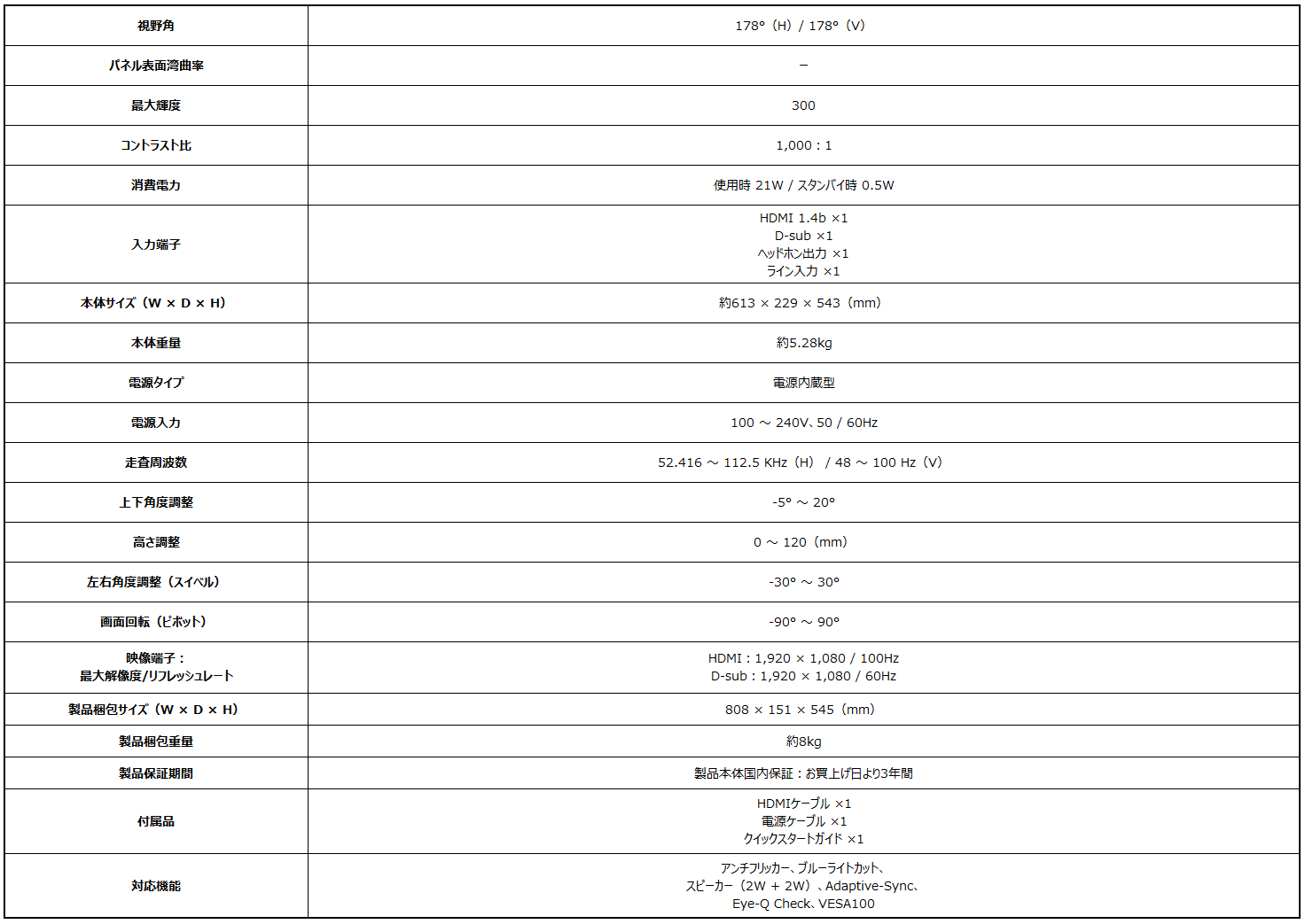 また、目の疲労具合や乱視、姿勢の確認などを行うことが可能なEye-Q Check機能、90°回転して縦表示にすることも可能な高性能スタンド搭載で様々なポジションで使用することができます。