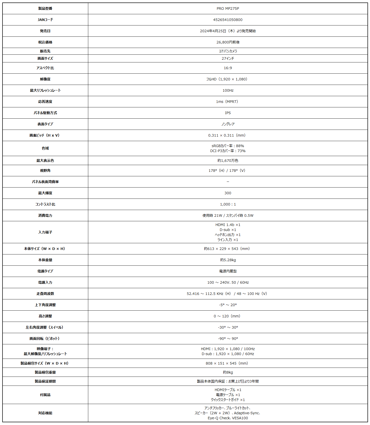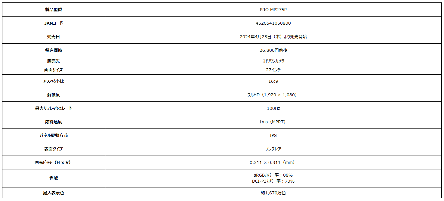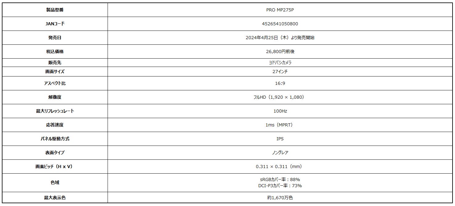 高画質IPSパネル・高性能スタンド搭載ビジネスモニター27インチ・フルHD・スクロール時も見やすいリフレッシュレート100Hz目に優しい機能を備えた「PRO MP275P」発売
