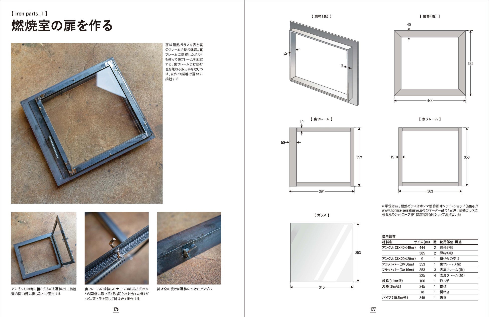 本書の巻末では、100V使用の溶接機を使って、耐熱ガラス入りの燃焼室の扉、燃焼室の天板、掃除口の蓋、ロストルといったパーツを製作する手順を丁寧に解説。蓄熱ストーブをまるごと自作したい人にも応える内容になっています。