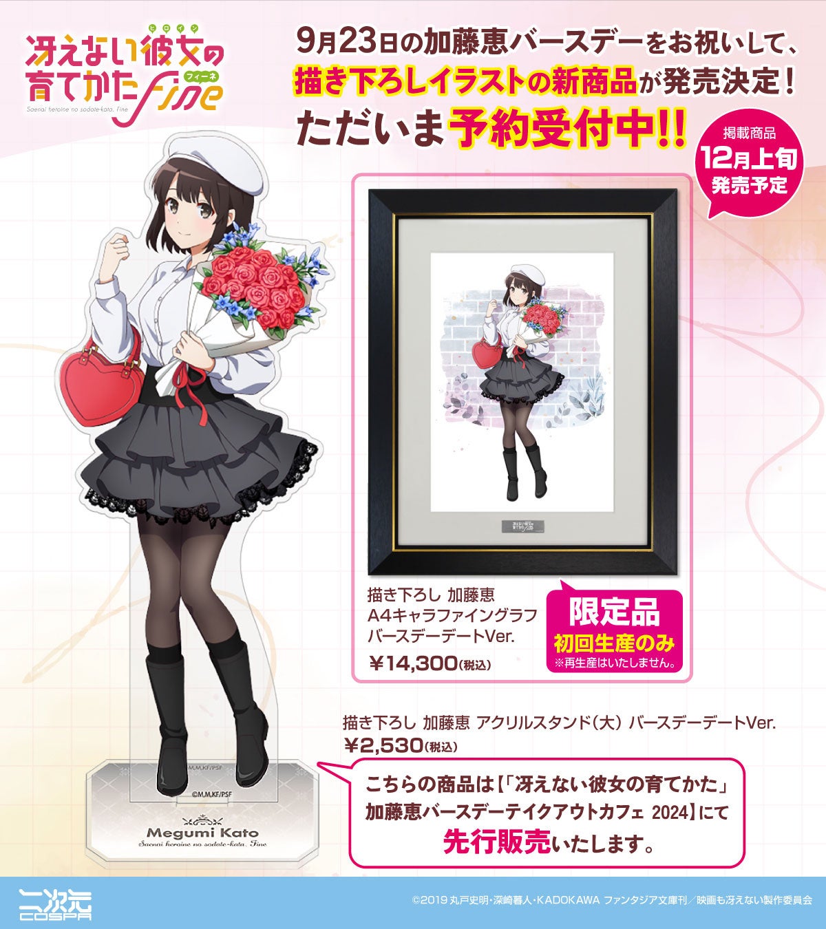 『冴えない彼女の育てかた Fine』より、描き下ろしイラストを使用した「【初回生産限定】描き下ろし 加藤恵 A4キャラファイングラフ バースデーデートVer.」や「描き下ろし 加藤恵 アクリルスタンド(大) バースデーデートVer.」など新グッズが二次元コスパから登場です。