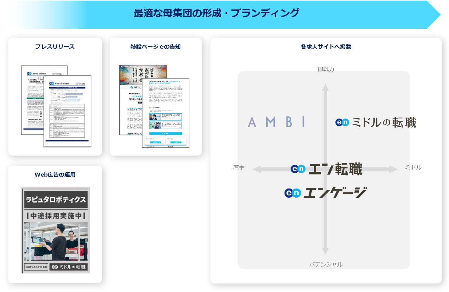 プレスリリースや特設ページ、Web広告での告知に加え、各求人サイトでの集客支援を実施。『エン転職』『エンゲージ』『AMBI』『ミドルの転職』とターゲットの異なる求人サイトを活用することで、ターゲットへ網羅的に求人を届けます。