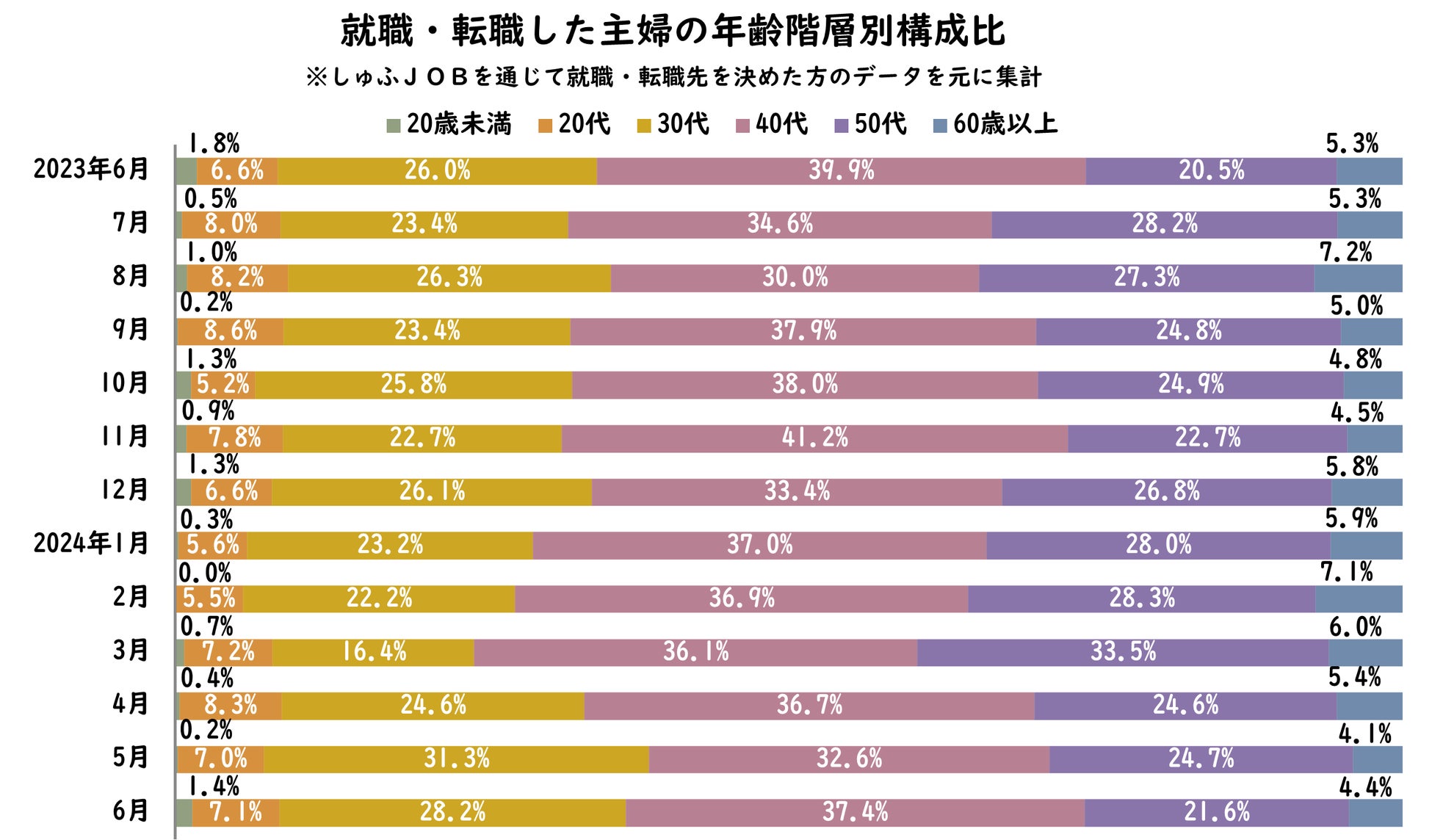 転職しゅふの平均年齢は、前月比-0.3歳、前年同月比-0.4歳の43.0歳。