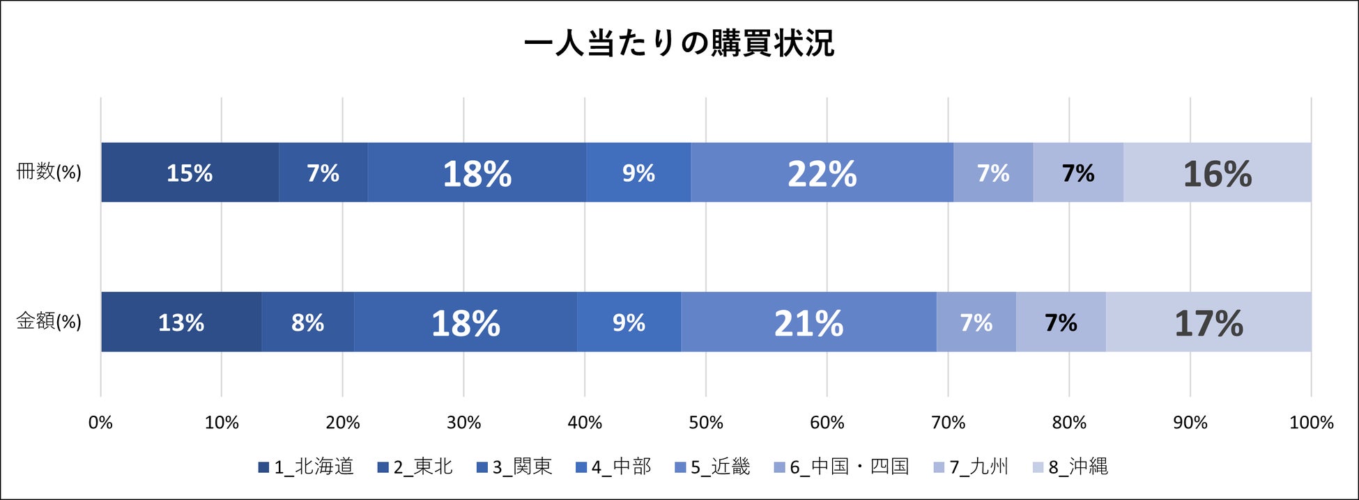 全国47都道府県を8地域※2 に分けて一人当たりの本(紙・電子書籍)の購買冊数・金額の割合を算出してみました。各地域の人口一人当たりの冊数・金額を合計したものを100として、地域別に構成比を比較してみると 、人口一人当たりの購買冊数・金額が最も多いのは「近畿」でした。次いで「関東」「沖縄」の順で、昨年調査から大きな変化は見られませんでした。