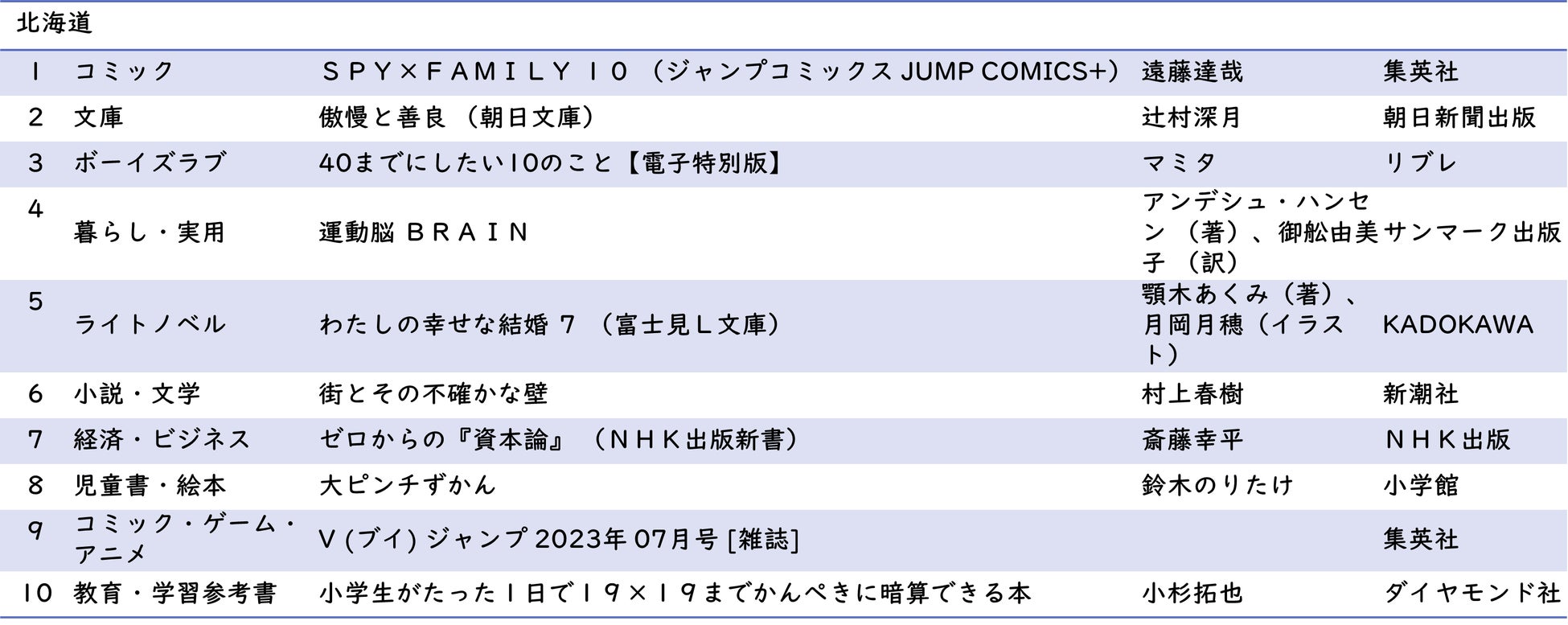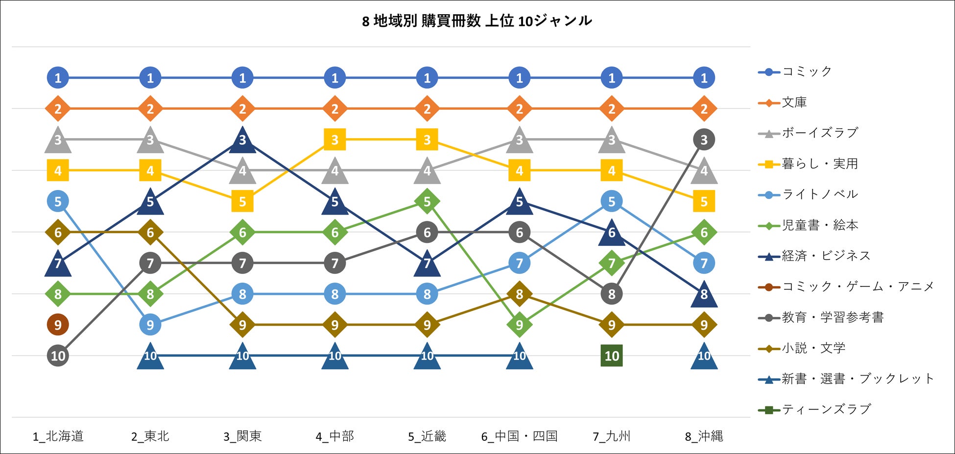 全地域で5位圏内に入ったジャンルごとに地域ごとの購買トップタイトルを順に見ていきます