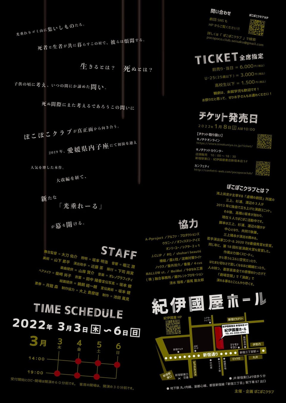 ぽこぽこクラブvol.8『光垂れーる』が2022年3月3日(木)〜2022年3月6日(日)に紀伊國屋ホール(東京都新宿区)にて上演されます。2019年、重要文化財・内子座にて初演を迎え、圧倒的な世界感で人気を博した本作。2020年若手演出家コンクールで最優秀賞を受賞した演出家による大改編を経て、新たな『光垂れーる』が幕を開けます。チケットはカンフェティ(運営:ロングランプランニング株式会社、東京都新宿区、代表取締役:榑松 大剛)にて発売中です。