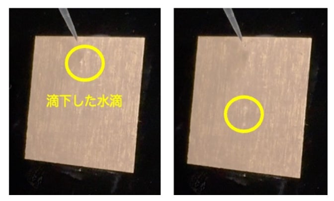 この構造色塗装したメラミン化粧板に水を滴下すると、水が弾かれて転がり落ちる様子が観察されました(図3 ※下記URLから動画もご覧ください))。このような効果はロータス効果(注5)として知られ、泥や埃などがついても雨が降ったら自然に流れ落ちる自浄効果を示します。