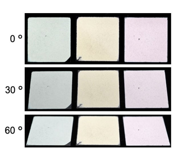 作製した疎水化メラニン粒子を分散させたヘキサン溶液をガラス基板上に滴下すると、沸点の低いヘキサンがすぐに蒸発し、わずか数分で構造色による塗装が完了しました。粒子配列の規則性を意図的に低下させたことで、角度を変えても色調が変化しない単色構造色が発現します(図1)。刷毛や筆で建築材などに使われるメラミン化粧板などに塗って塗装することも可能です。得られた構造色塗装表面は、粒子表面の疎水性分子と、粒子同士が形成する階層的な凹凸構造の相乗効果により、水の接触角(CA)が160度以上となる超撥水性を示しました(図2)。