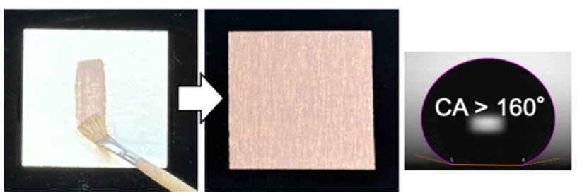 千葉大学大学院工学研究院の桑折道済教授と融合理⼯学府博士前期課程2年の前島結衣氏らの研究グループは、武田コロイドテクノ・コンサルティング株式会社の武田真一氏と国立研究開発法人物質・材料研究機構(NIMS)の不動寺浩主席研究員らと共同で、超撥水性を示す構造色塗装が可能な技術を開発しました。疎水化メラニン粒子を含む溶液を刷毛や筆で塗ると、わずか数分で構造色による塗装が可能です。塗装後の表面は超撥水性を示し、水を弾くのみならず自浄作用を示すことから、次世代塗装材料としての応用が期待されます。