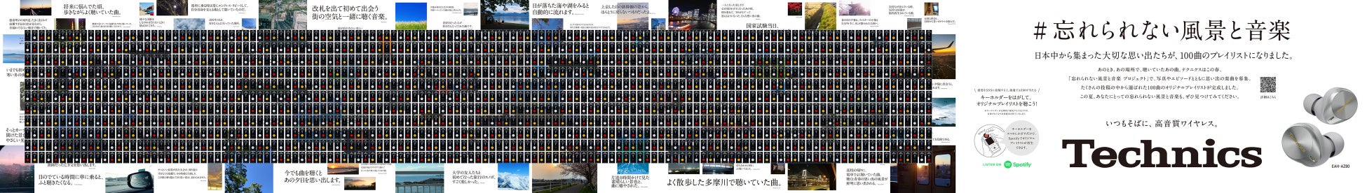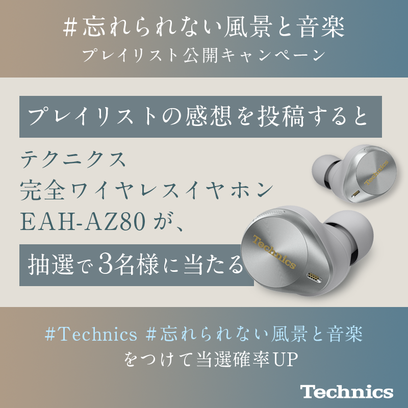 プレイリストの感想を投稿いただいた方の中から抽選で3名様にテクニクスの完全ワイヤレスイヤホンEAH-AZ80が当たる、「#忘れられない風景と音楽」の第2弾キャンペーンをX(旧Twitter)で実施中です。応募方法や応募規約など、詳細は特設サイトにてご確認ください。