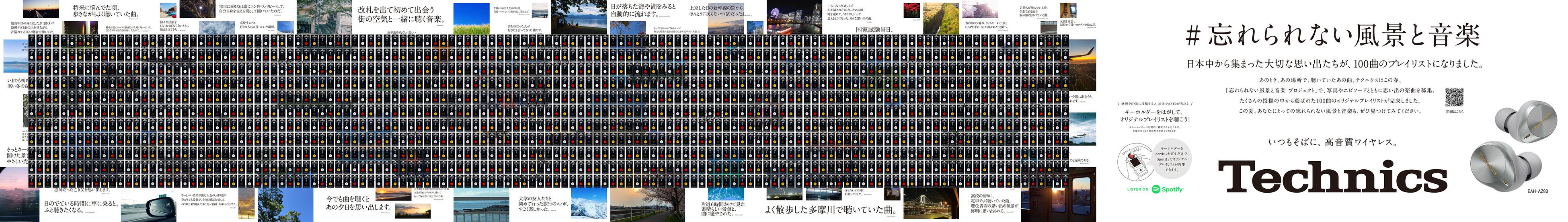 本プロジェクトは、2024年4月22日に第1弾を開始し、六本木や下北沢、渋谷の駅構内でポスター広告を掲出したほか、思い出の楽曲と写真、エピソードを募集するSNS投稿キャンペーンを展開しました。結果、3,000件近い関連投稿が集まり、多くの方に大変ご好評をいただきました。そして今回、プロジェクトの第2弾として、第1弾のキャンペーンで集まった投稿の中から写真やエピソードを踏まえて選出した100曲を収録したテクニクス公式のオリジナルプレイリストを作成。そのプレイリストを再生できる4種類のミュージックキーホルダーも制作し、新宿と梅田にてピールオフ型ポスター広告で配布。あわせて、プレイリストの感想を投稿すると抽選でテクニクスの完全ワイヤレスイヤホンEAH-AZ80が3名様に当たるSNSキャンペーンをX(旧Twitter)で展開中のほか、第1弾で集まった写真とエピソードを紹介するプロジェクトムービー「みんなの思い出」篇を7月29日(月)より公開しています。