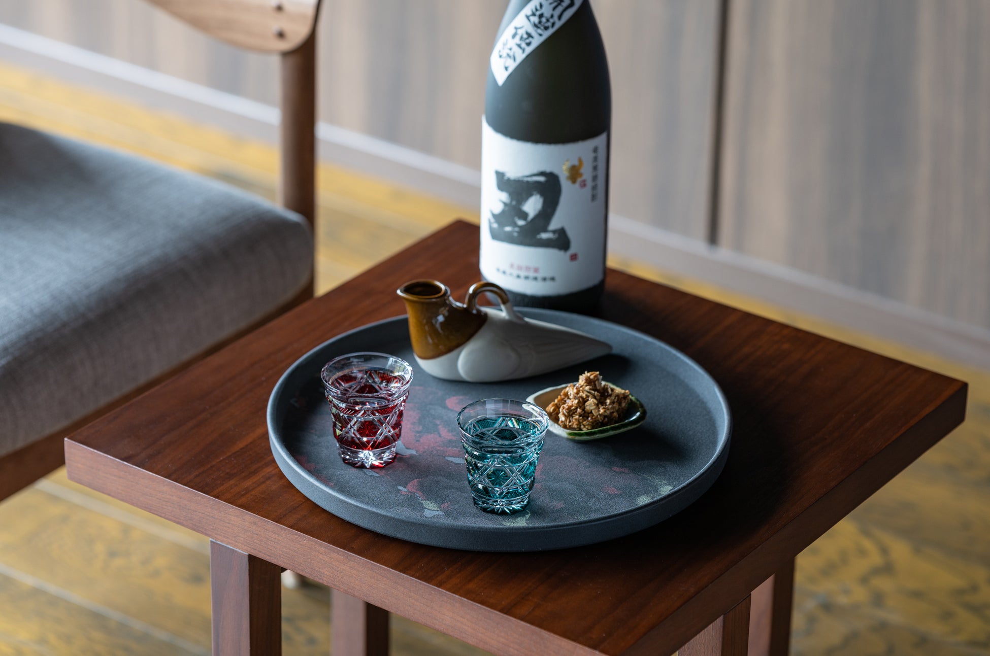 夕食では霧島神宮の本殿や大鳥居の鮮やかな朱色を彷彿とさせる宝楽盛りのお供に、鹿児島県奄美大島で限定千本しか製造されない黒糖焼酎「開運伝説」を提供します。その年を無事に過ごせたことへの感謝と翌年の努力の決意が込められた黒糖焼酎は、強いコクとやさしく甘い香りが特徴です。プレミアムな焼酎を、縁起の良い文様が刻まれた薩摩切子のグラスで味わいます。