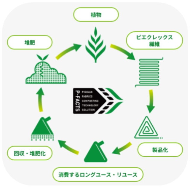 「P-FACTS」(ピーファクツ:PIECLEX FAbrics Composting Technology Solution)は、ピエクレックス社が植物由来のポリ乳酸素材「電気の繊維」ピエクレックスを使用したアパレル製品や繊維製品を回収し、堆肥化までを一貫して行う循環インフラです。