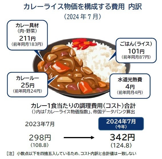 帝国データバンクは、生鮮食品などの値上げを加味した食卓への影響度を示す「カレーライス物価指数」を独自に試算した。カレーライス物価を構成する費用の内訳をみると、最も費用が高いのが全体の約6割を占める「カレー具材(肉・野菜)」で、前年同月から28円増の211円だった。輸入牛肉の価格上昇が続いていることに加え、ジャガイモを中心に野菜類の価格が高値圏で推移したことが影響した。また、7月は「ごはん(ライス)」価格の値上がりが目立った。ライスの1食当たり費用は101円と前年同月(87円)から14円増加し、過去10年で最高値となった。「カレールー」(24円→25円)、炊飯器での炊飯やガス調理などの「水道光熱費」(4円、変化なし)では、前年同月から大幅な変化はなかった。