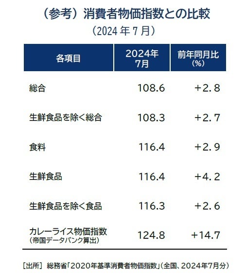 カレーライス物価を基に、2020年平均を100とした独自算出の「カレーライス物価指数」をみると、2024年7月の指数は124.8、前年同月比では14.7%上昇し、14カ月連続のプラスとなった。10%を超える上昇幅は2015年以降の10年間で初めてとなり、急騰ぶりが鮮明となった。