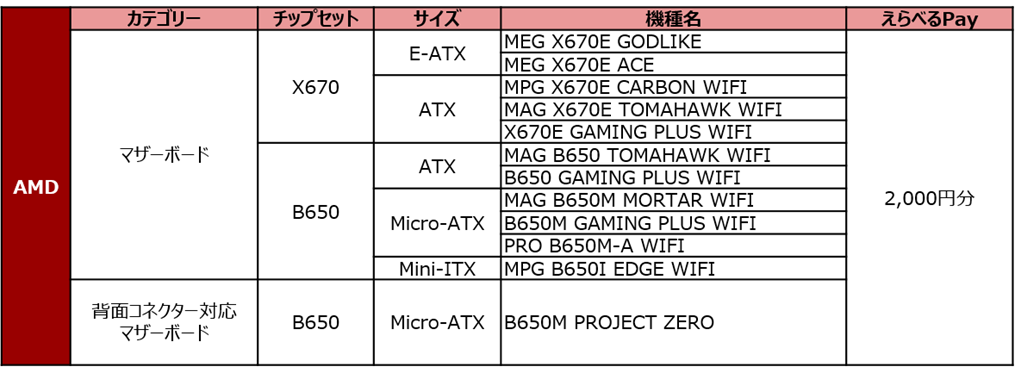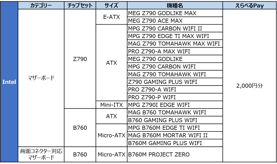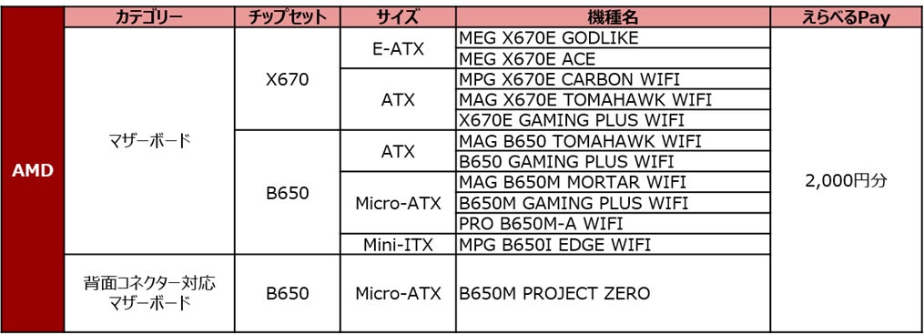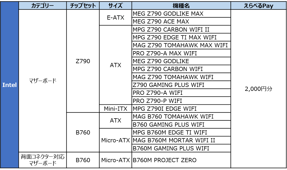 キャンペーン期間中に対象のZ790/B760/X670/B650チップセットを搭載したDDR5メモリ対応マザーボード、または背面コネクタ設計「PROJECT ZERO」シリーズマザーボード、MSI簡易水冷クーラーや電源ユニット、PCケースを購入後、指定サイトにレビューを投稿いただいた方全員に、最大2,000円分のえらべるPayをプレゼントいたします!