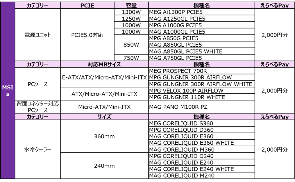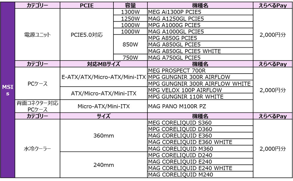 MSI、対象のチップセット搭載マザーボードや一部のMSI 簡易水冷クーラー・電源・PCケースを購入後、指定サイトにレビューを投稿した全員に2,000円分のえらべるPayが必ずもらえる!