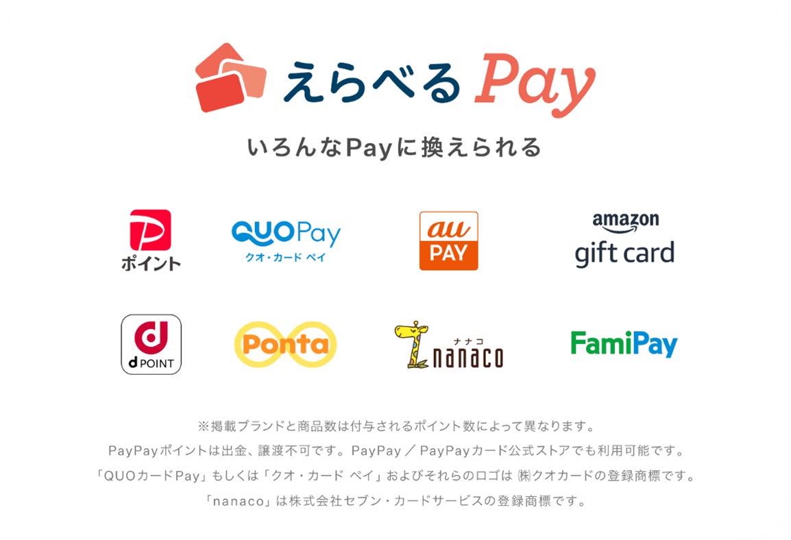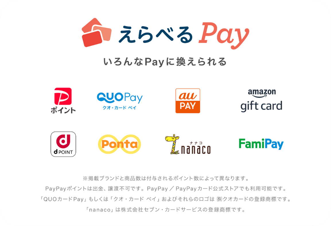 「えらべるPAY」のロゴは登録商標です。PayPayポイントは出金、譲渡不可です。PayPay/PayPayカード公式ストアでも利用可能です。