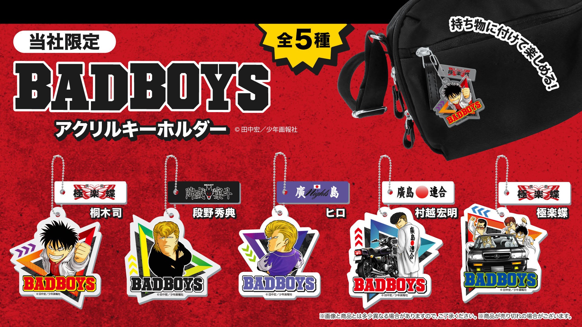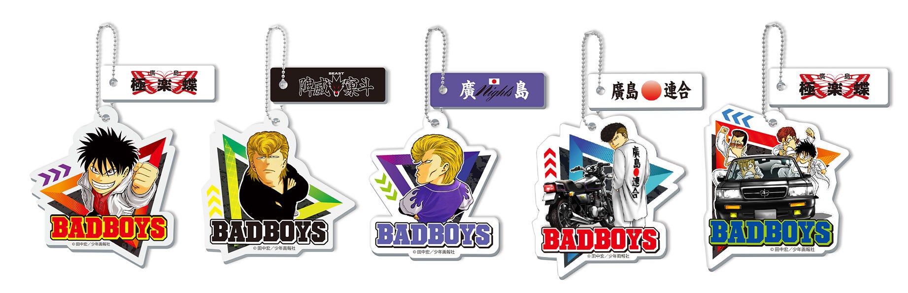広島を舞台に、富豪の息子で暴走族「極楽蝶」の八代目頭となる主人公・桐木司の青春の日々を描いた漫画『BADBOYS』がアクリルキーホルダーになって登場。「極楽蝶」の桐木司、岩見エイジ、川中陽二、中村寿雄、「陴威窠斗」の段野秀典、「廣島Night's」のヒロ、「廣島連合」の村越宏明がデザインされた「BADBOYSアクリルキーホルダー」全5種類を展開いたします。