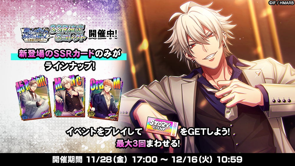 専用のGコレクトチケット「SSR確定:ストーリーイベント 前編」を使用することで回せるSSR確定のGコレクトを開催します。新たに登場した「SSR【極道ホスト】碧棺左馬刻」「SSR【警官ホスト】入間銃兎」「SSR【軍人ホスト】毒島メイソン理鶯」のいずれかを獲得することができます。「SSR確定:ストーリーイベント 前編」はイベントアイテムと交換するほか、イベントチケット(赤)を手に入れ「聖しこの夜はあなたとともに2 前編~今宵限りのNo.1~ 報酬BOX Gコレクト」を回すことで、最大3枚まで入手可能です。詳細はアプリ内でのお知らせをご確認ください。