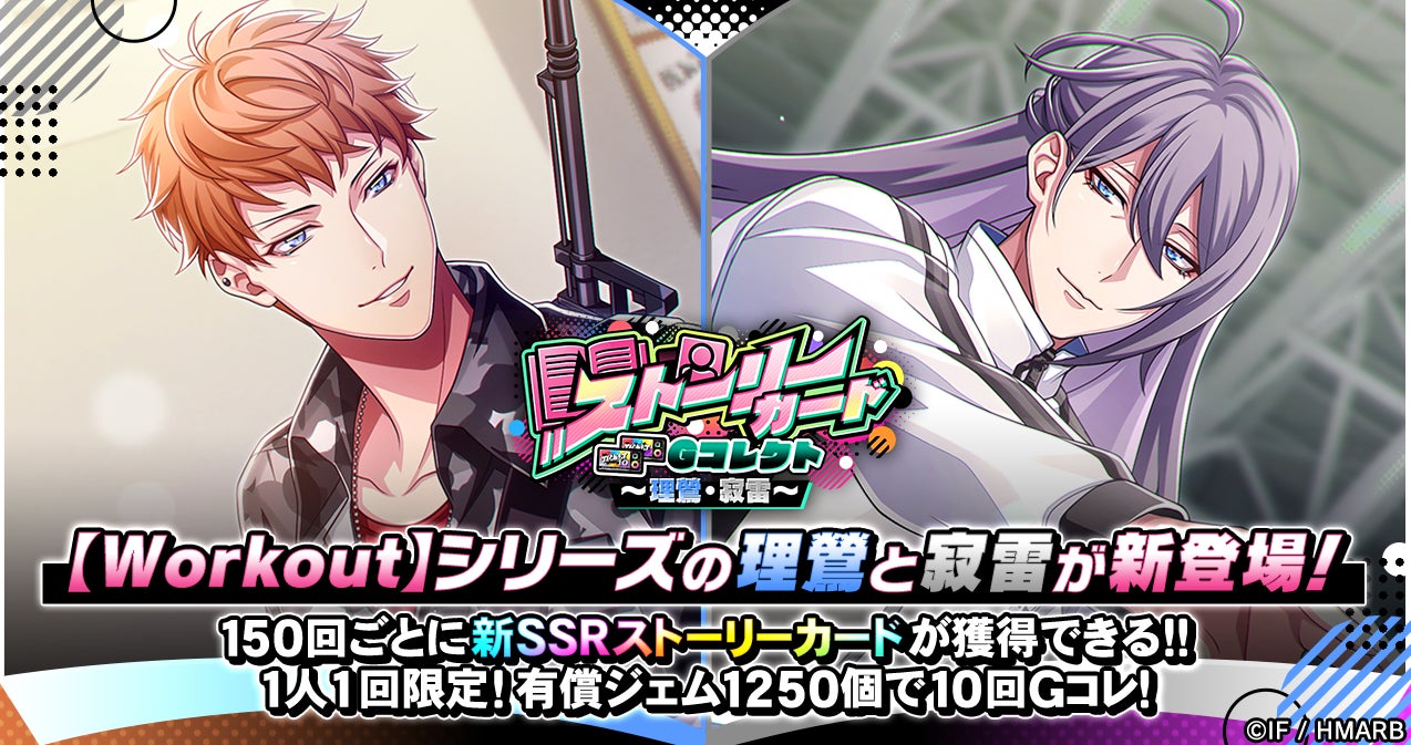 新ストーリーカード「SSR【Workout】毒島メイソン理鶯」と「SSR【Workout】神宮寺寂雷」を獲得することができるGコレクトを開催しています。Gコレクトはジェムのほか、専用チケット「ストーリーGコレチケット(vol.3)」各種を使うことでも回すことができ、ビンゴミッションとログインボーナスで最大150回分のチケットを獲得できます。
