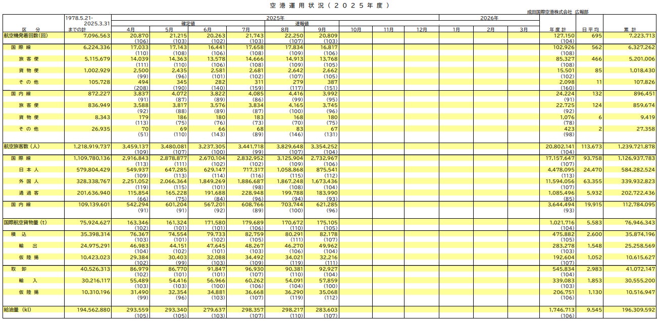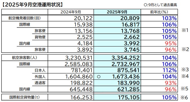 2025年9月 空港運用状況 外国人旅客数が9月として過去最高の167万人に