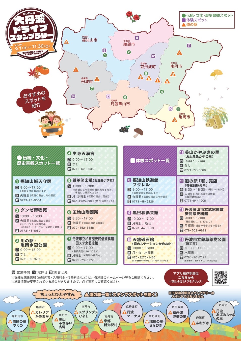 ■大丹波地域(※)の魅力をPRし、地域内外からの自動車ドライバーなどの誘客を進めるため、JAF(一般社団法人日本自動車連盟)と連携して、全14カ所のスポットを巡るスタンプラリーを開催します。