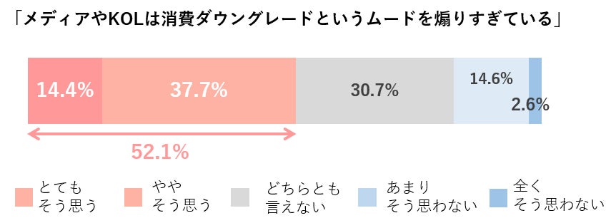 ・安価で安定した品質のものが入手できるようになった現状を歓迎する一方、昨今の消費ダウングレードのムードをメディアやKOL(Key Opinion Leader)が煽りすぎていると感じている人は過半数に(データ4)。
