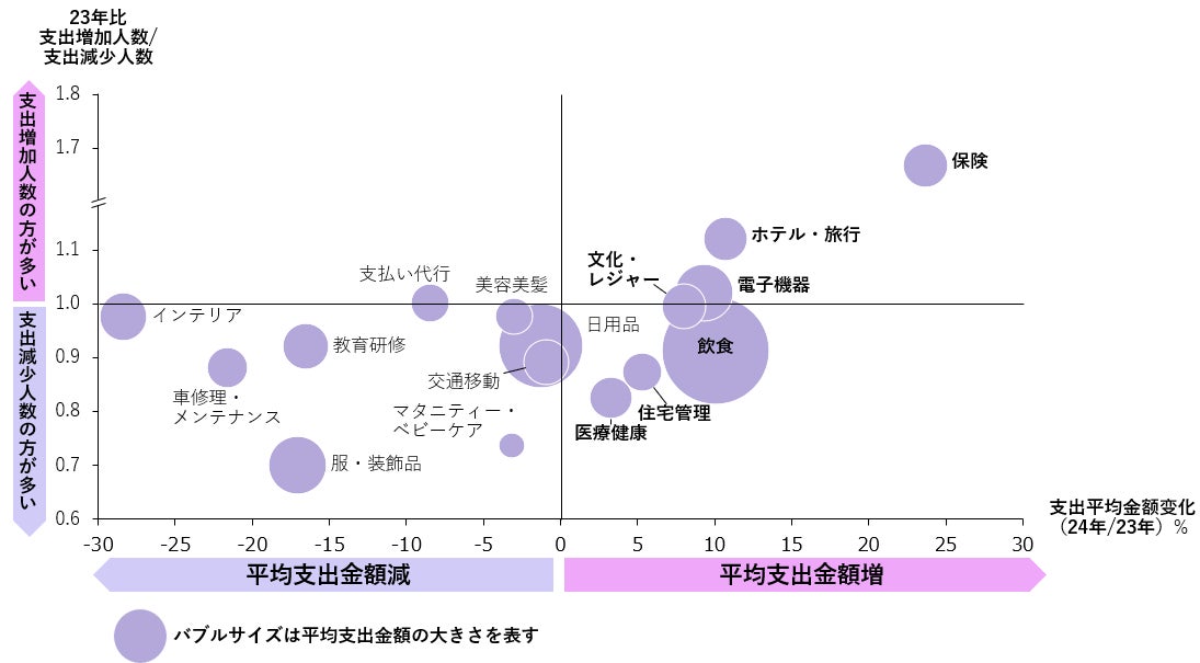 ・また、保険、飲食旅行、文化・レジャー、電子機器、住宅、医療カテゴリーは、平均支出金額が2023年比で増加しています(データ2)。