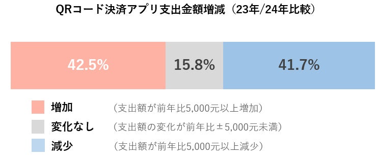・生活者の消費意欲は100点満点中67.3点と、5年前(2019年)の調査の74.0点から低下しており、消費ダウングレード、節約志向、コスパ重視といった大きな潮流を反映しています。(※消費意欲の点数は、2019年実施調査の対象者に合わせ、1級都市在住者ベースで比較)・一方で、生活者400名のQRコード決済アプリの利用データを分析したところ、2023年と比較して支出金額が増加した人と減少した人はほぼ同数になりました(データ1)。