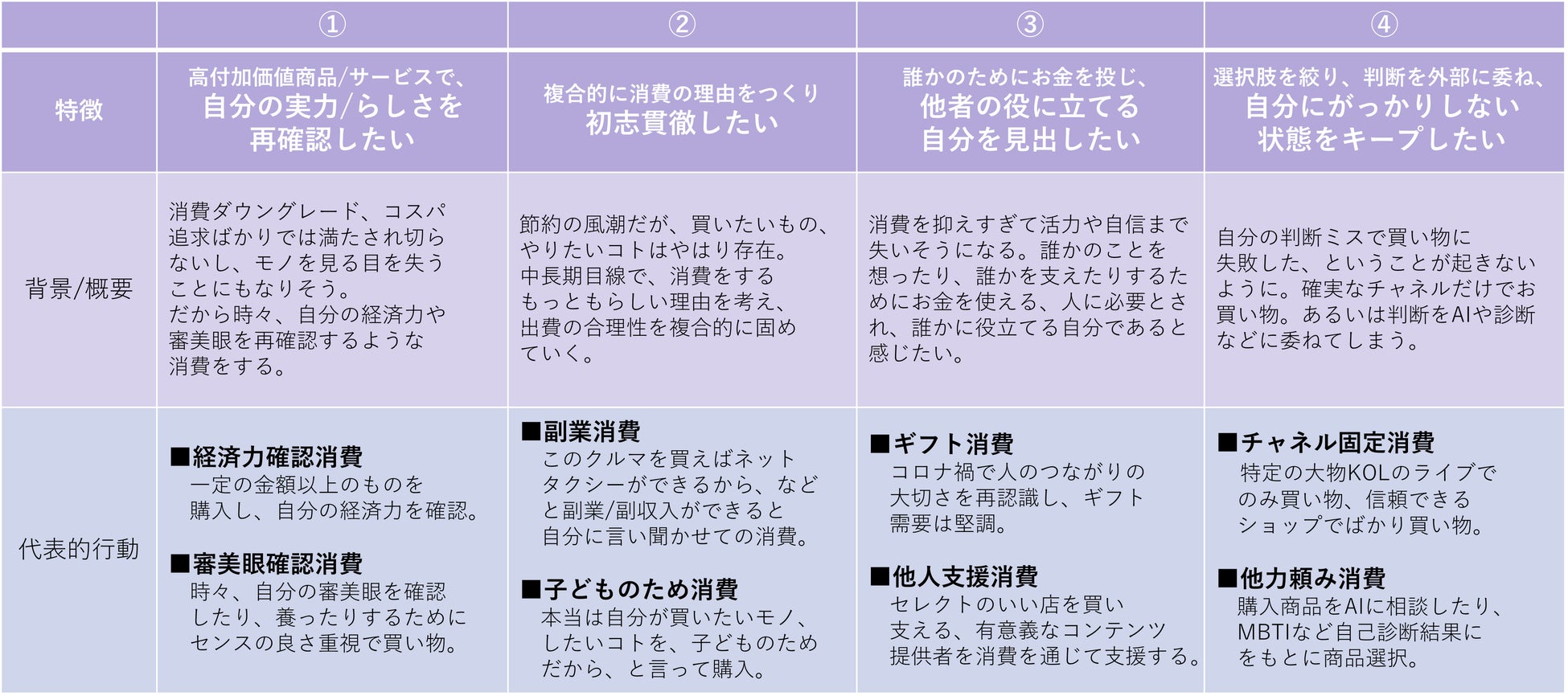 ・また、買い物に失敗してがっかりすることがないように、信頼するKOLや定評のあるお店でのみ買い物をする人や、AIや性格診断の結果をもとに商品を選択する人など、情報収集や判断を自分以外の何かに委ねるという行動も出てきています。