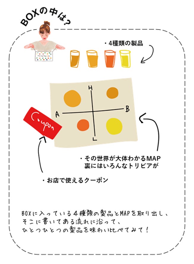 今回は、第1弾での検証結果を踏まえ、東京メトロ沿線の魅力ある食の専門店と協働し、新たな体験を提供することを目指して、専門店が取り扱う「4種の商品」と、その商品の味や特徴を4象限に分類した「MAP」をセットにしたボックスを販売します。お店の方が語る商品の魅力や産地・製法・種類ごとの違い、その商品にまつわるコラム等が記載されたMAPを見ながら食べ比べることで、商品への理解が深まり、新たな“発見”に繋がる体験を提供します。さらに、「MAP」は実店舗を訪れて使用できるお得なクーポン券としてご利用いただくこともできます。