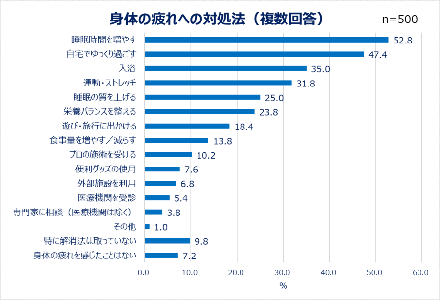 対処法 身体・心ともに上位は「睡眠時間を増やす」「自宅でゆっくり」「入浴」