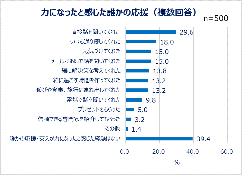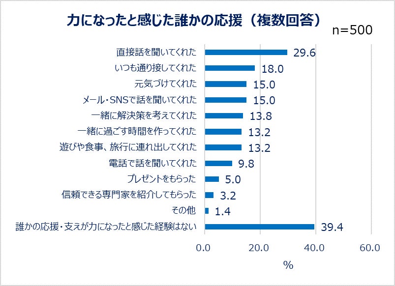 心の疲れを感じたとき、誰かに話している人が一定数いることが分かりました。誰かに応援されたことが、力になったと感じた経験について聞いたところ、6割以上が、誰かの応援が力になった経験があることが分かり、特に「直接話を聞いてくれた(29.6%)」ことが力になった人が多い結果となりました。