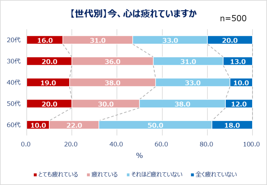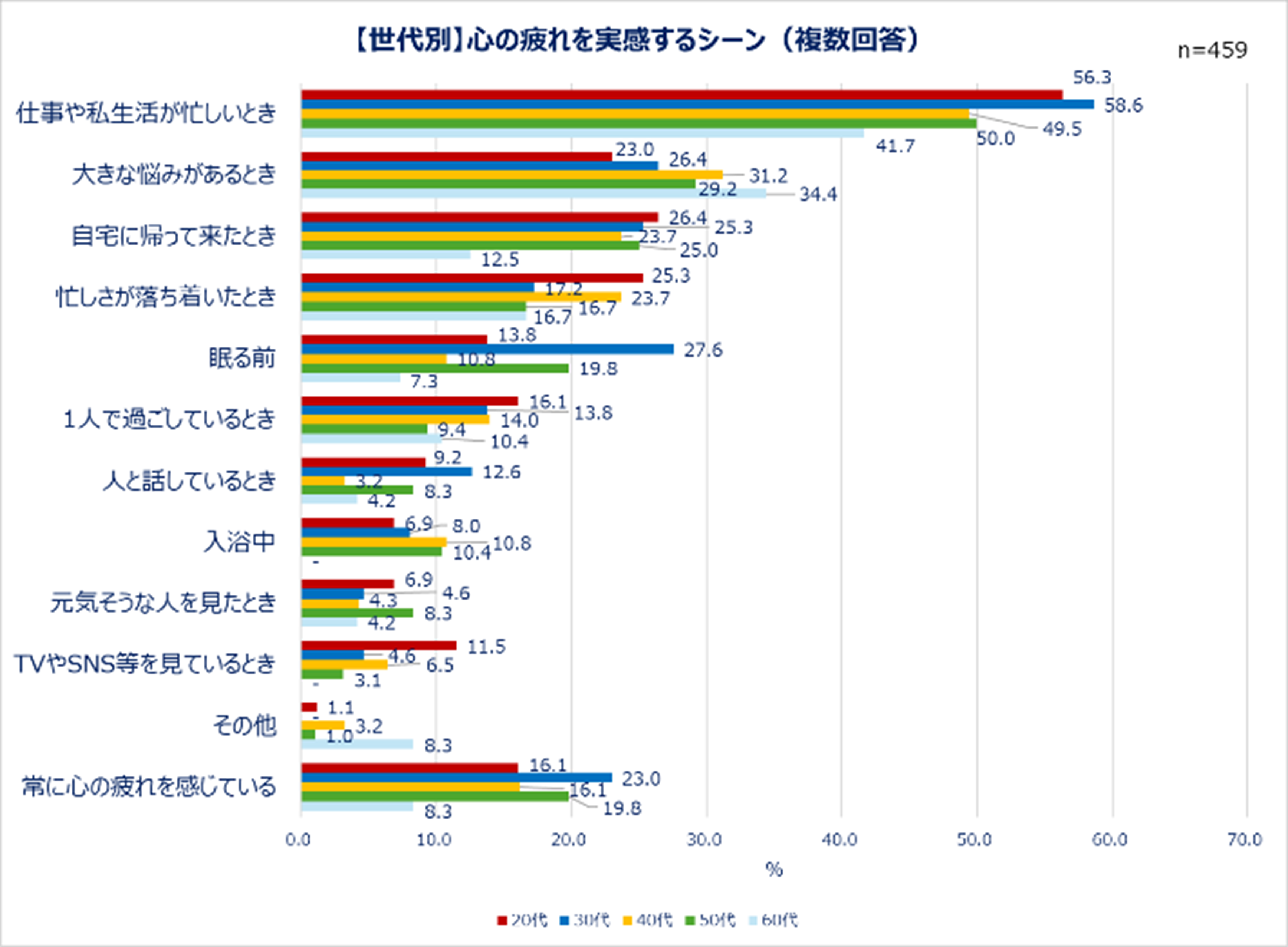 身体と比べると見た目に出づらく、見過ごしてしまう場合もある心の疲れ。どのようなときに実感するか聞いたところ、「仕事や私生活が忙しいとき(51.0%)」が1位でした。世代別で見ると、30代は「眠る前(27.6%)」と回答した人が、20代は「忙しさが落ち着いたとき(25.3%)」「TVやSNS等を見ているとき(11.5%)」と回答した人が他の世代と比べると多いなど、各世代の傾向も見えました。