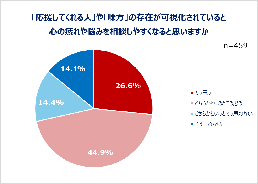 さらに、7割以上の人が、応援してくれる人や味方の存在が可視化されていると、心の疲れや悩みを相談しやすくなると回答。ただ話を聞いてくれたり、助けてくれたりする人がいると分かるだけでも、自分は一人ではないと実感でき、前向きな意欲を取り戻すきっかけになり得るのではないでしょうか。