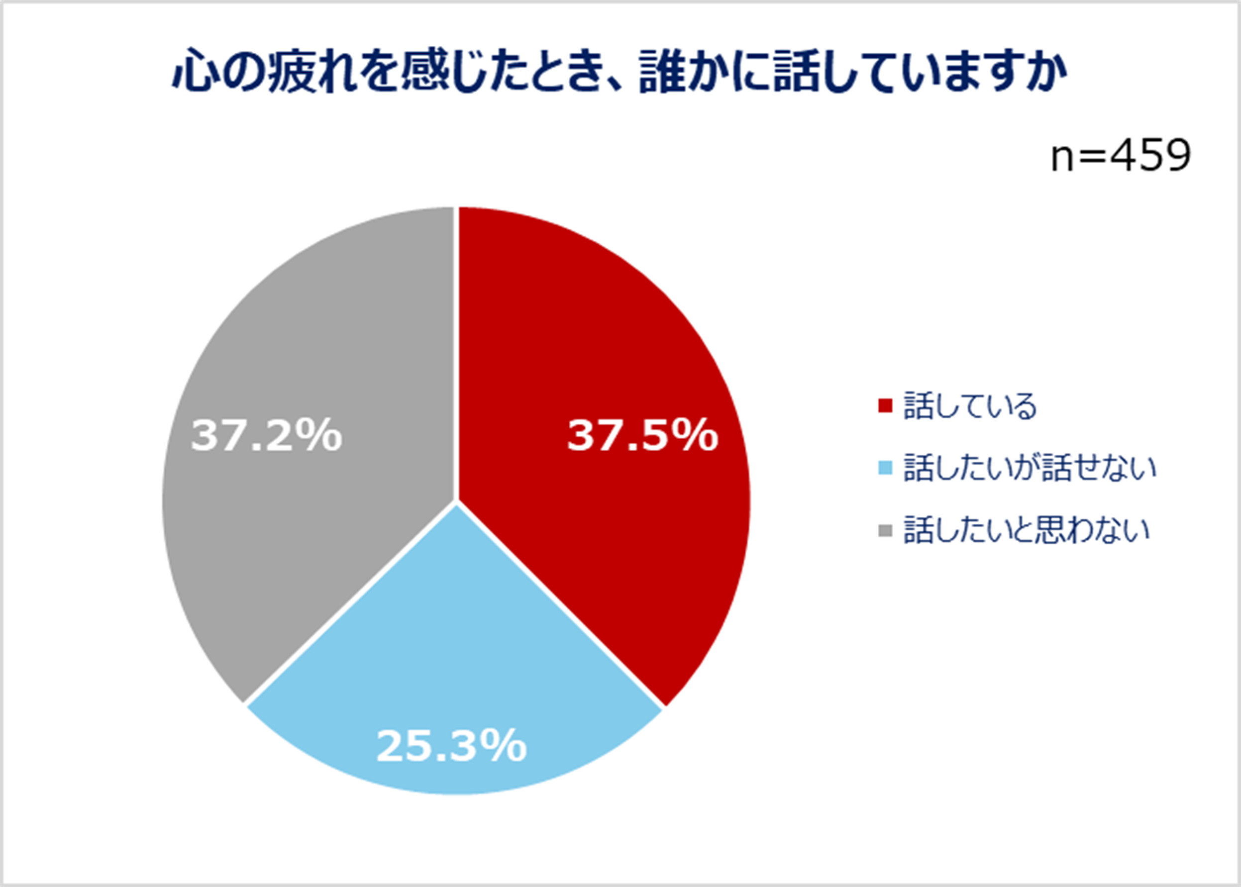 心の疲れについて、7割以上が「一人で抱え込んだ経験がある」ことも判明。誰かに話している人は4割以下でした。4人に1人は「話したいが話せない(25.3%)」と回答。誰かに話せる環境があることも、心の疲れ解消における重要なポイントなのかもしれません。