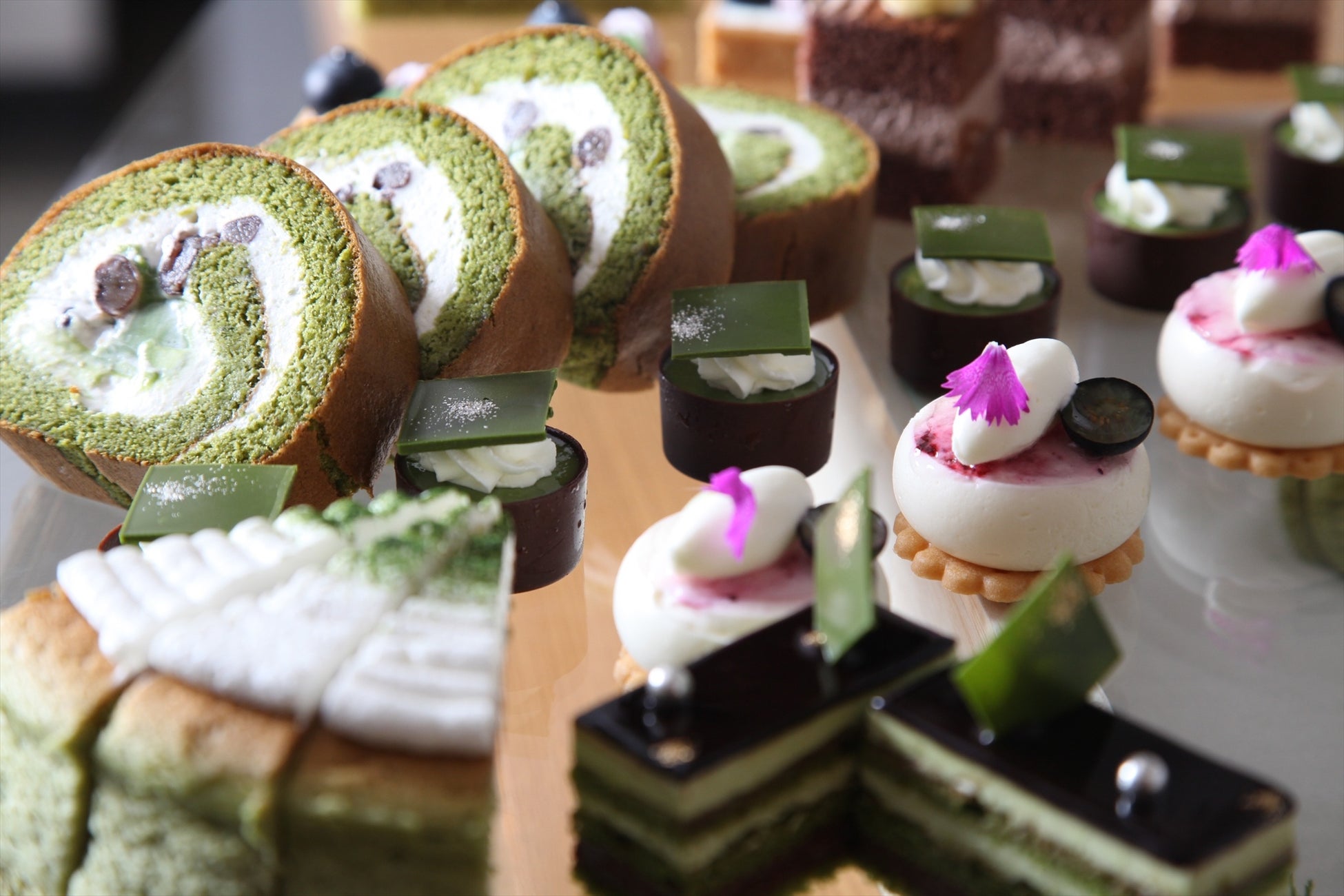 契約農家から届くフレッシュブルーベリー、宇治抹茶と阿波和三盆糖を贅沢に使ったスイーツ、ベルギーのベルコラーデやシンガポールのアルティザンなど世界のショコラを使用したショートケーキ、マカロン、ティラミス、プリンほか和と洋の調和が絶妙な特別なスイーツを約20種ご用意。