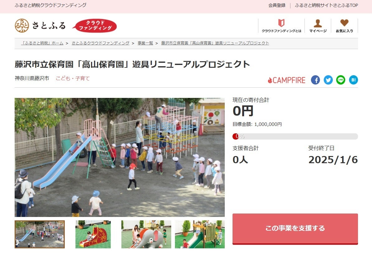 神奈川県藤沢市とふるさと納税ポータルサイト「さとふる」を運営する株式会社さとふる(本社:東京都中央区、代表取締役社長 兼 CEO:藤井 宏明)は、「さとふるクラウドファンディング」にて、「藤沢市立保育園『高山保育園』遊具リニューアルプロジェクト」の寄付受け付けを2024年11月15日より開始します。