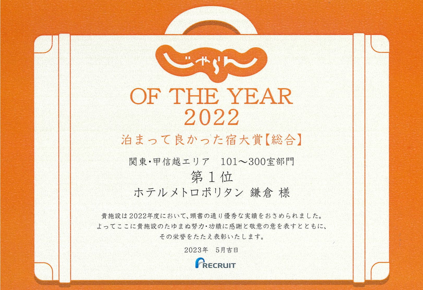 【ホテルメトロポリタン 鎌倉】 じゃらん OF THE YEAR 2022「泊まって良かった宿大賞」関東・甲信越エリア 101~300室部門で1位受賞