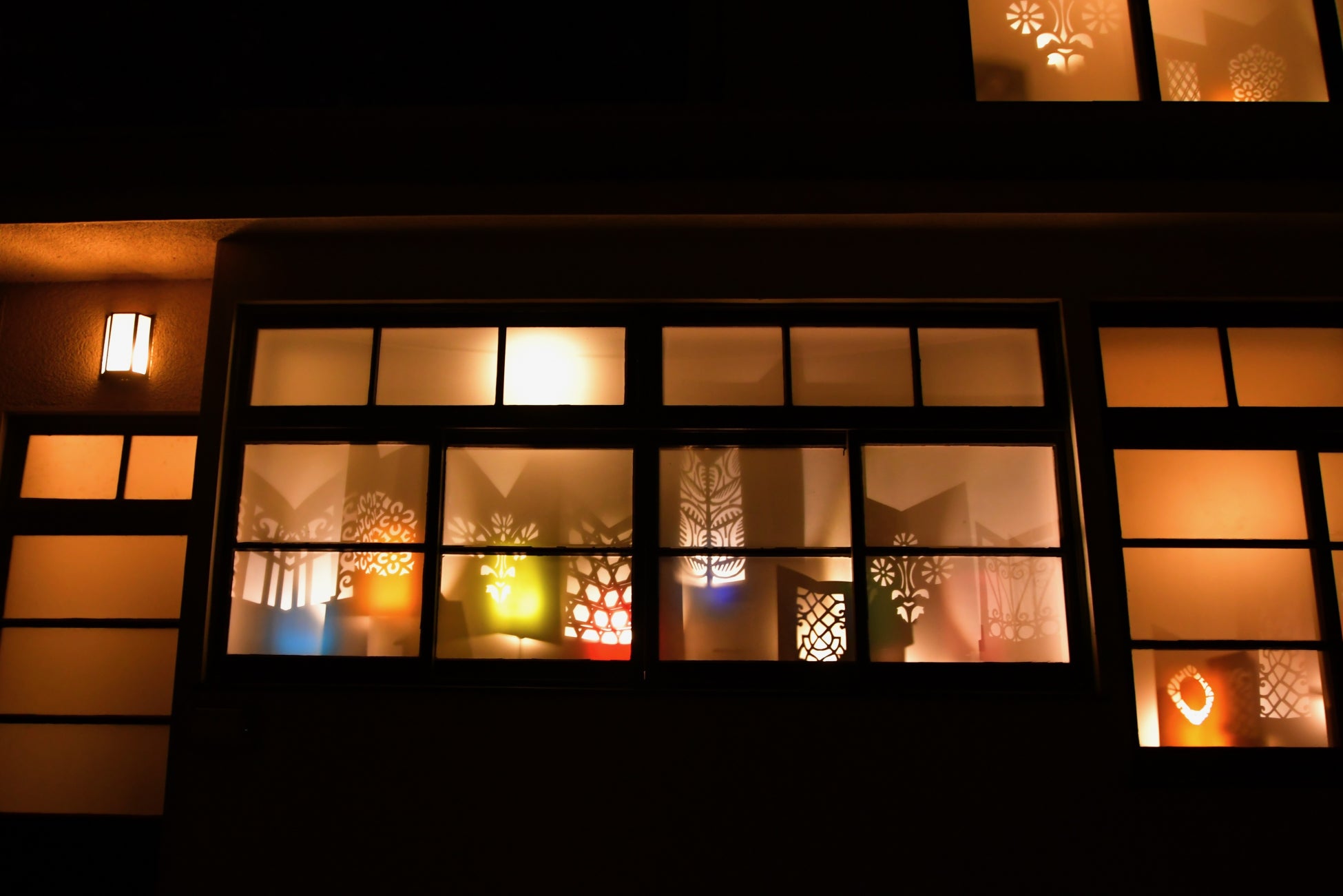 🍁たてもの文様切り紙の展示|山の手通りに面した窓に、様々な文様のシルエットが浮かびます。