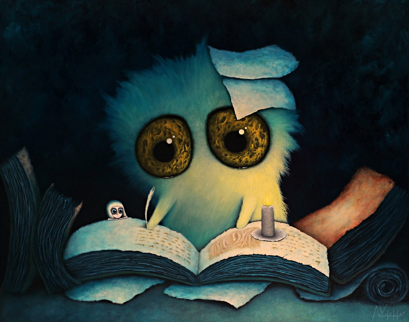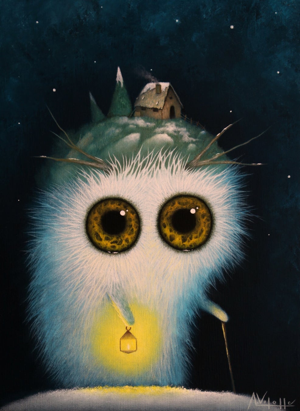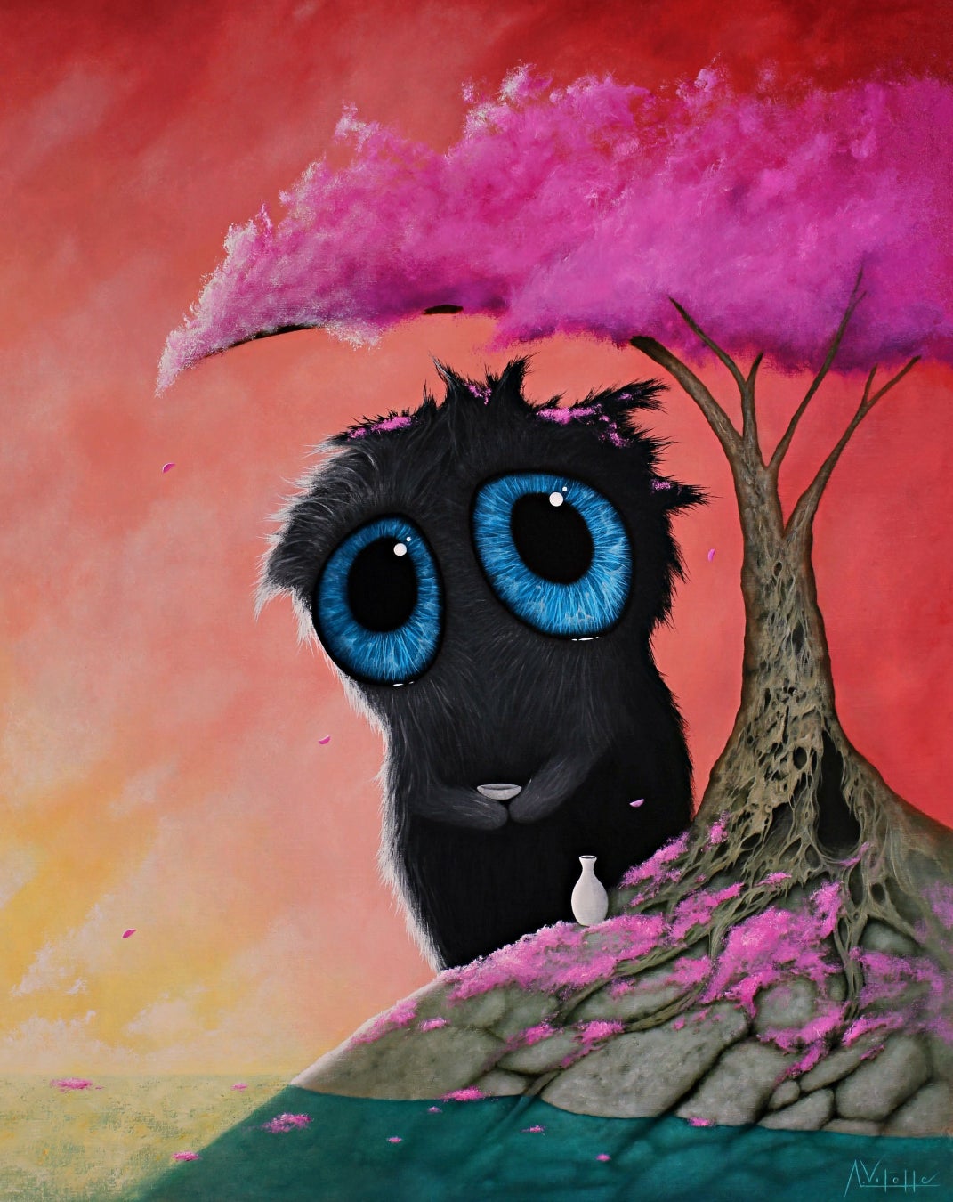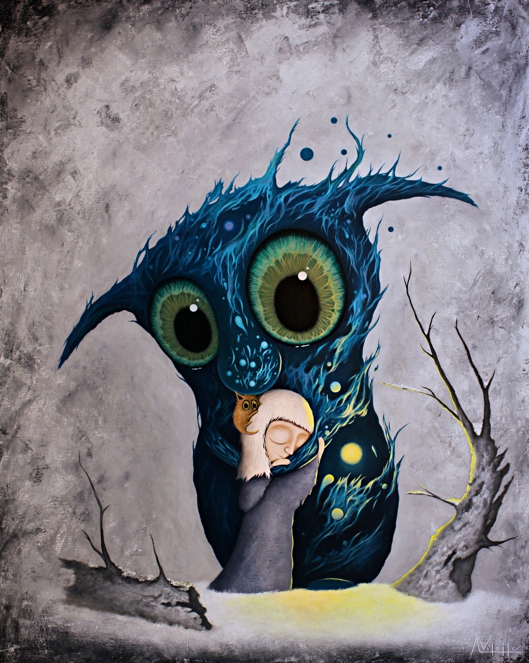 August Vilellaの描くキャラクターは大きな目を特徴としており、その洞察に満ちたまなざしを通して鑑賞者は深い感情へと誘われます。シュルレアリスムと自然界とを融合させた独自の視点の表現と、古典的な油絵の技法を用いた光と影の使い方、洗練された筆致は、オールドマスターの作品を思い起こさせつつも、画面上では彼の描く想像上のキャラクターと融合しています。
