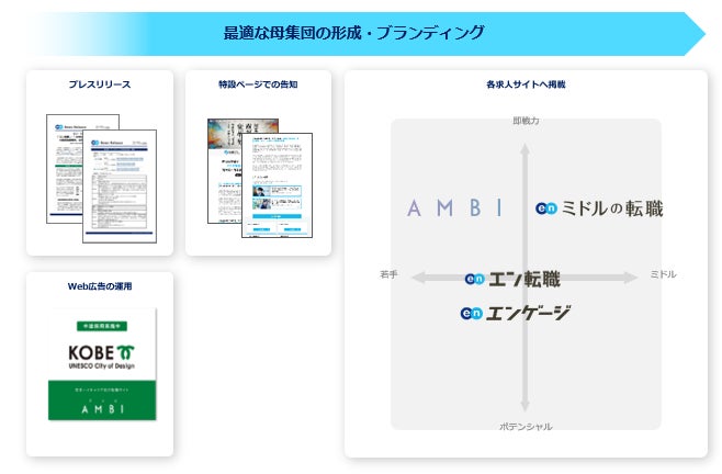 プレスリリースや特設ページ、Web広告での告知に加え、各求人サイトでの集客サポートを実施いたします。『エン転職』『エンゲージ』『AMBI』『ミドルの転職』とターゲットの異なる4つの求人サイトを活用することで、ターゲットへ網羅的に求人を届けます。