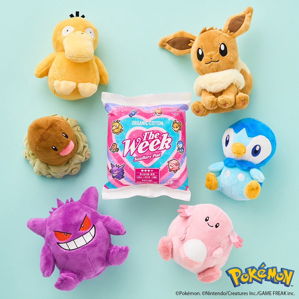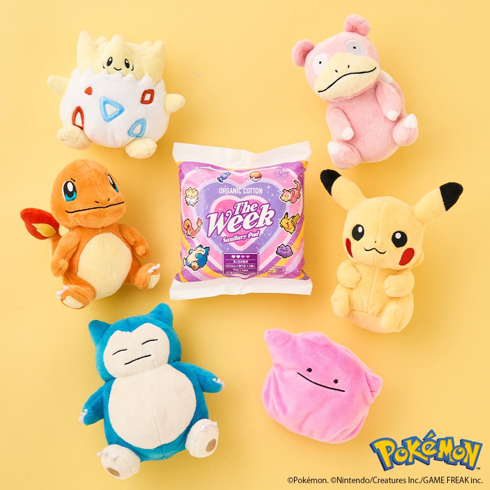 2022年3月、プロジェクト第一弾商品として企画し、全国のPLAZA・MINiPLAにて好評販売中のオリジナルパッケージのオーガニック生理用ナプキン「The Week Sanitary Pad」。“コスメやお菓子を購入するように、お買い物を楽しみながら、ストレスなく気軽に生理用品を購入してほしい”というプロジェクトメンバーの想いが込められ、海外雑貨のようなポップでキュートなパッケージで人気のアイテムです。そんな「The Week Sanitary Pad」から、ポケモンがデザインされたパッケージ2種(非売品)が登場します。